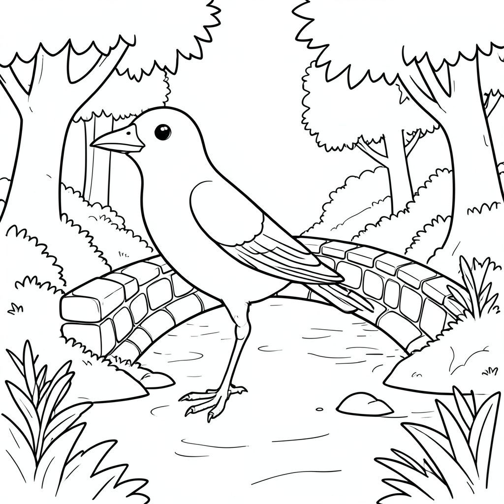 solo, một con chim, một đầu, hai mắt, một mỏ, hai cánh, hai chân, một đuôi, tỷ lệ tự nhiên, quy mô thích hợp trong môi trường, đúng giải phẫu, chim, cầu đá, suối rừng, nước bập bẹ, cây, tán lá, ánh sáng mặt trời, nền đơn giản, đường sạch, sách truyện, thuần khiết, trang màu, nghệ thuật đường, nền trắng, solo, chủ đề đơn, đúng giải phẫu, giải phẫu hoàn hảo