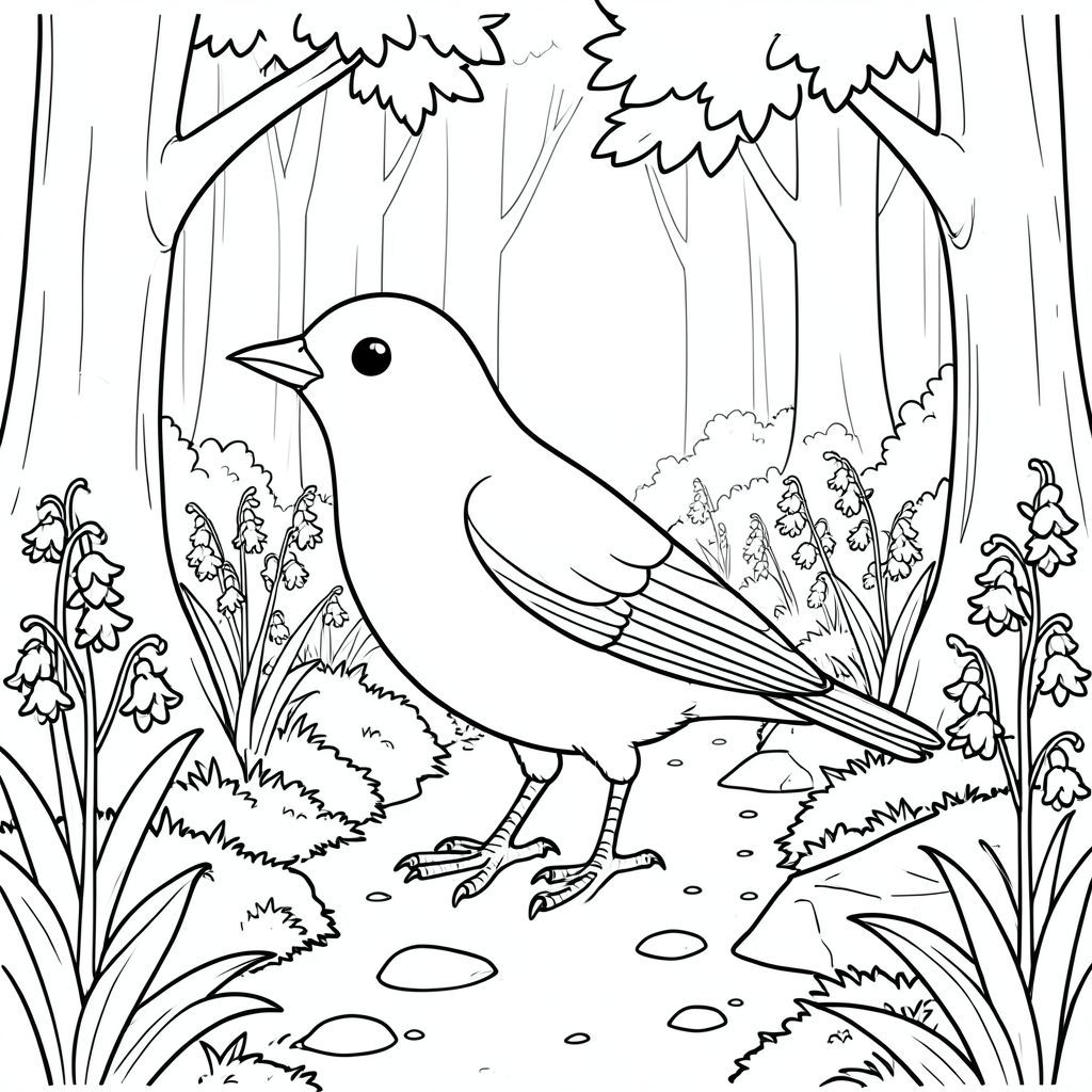 solo, một con chim, một đầu, hai mắt, một mỏ, hai cánh, hai chân, một đuôi, tỷ lệ tự nhiên, quy mô thích hợp trong môi trường, đúng giải phẫu, chim, con đường rừng cây, lốm đốm, chuông xanh, rừng, cây cối, lá, rêu, đá, bụi bẩn, con đường, trang tô màu, nghệ thuật đường, nền trắng, solo, chủ đề đơn, chính xác về mặt giải phẫu, giải phẫu hoàn hảo