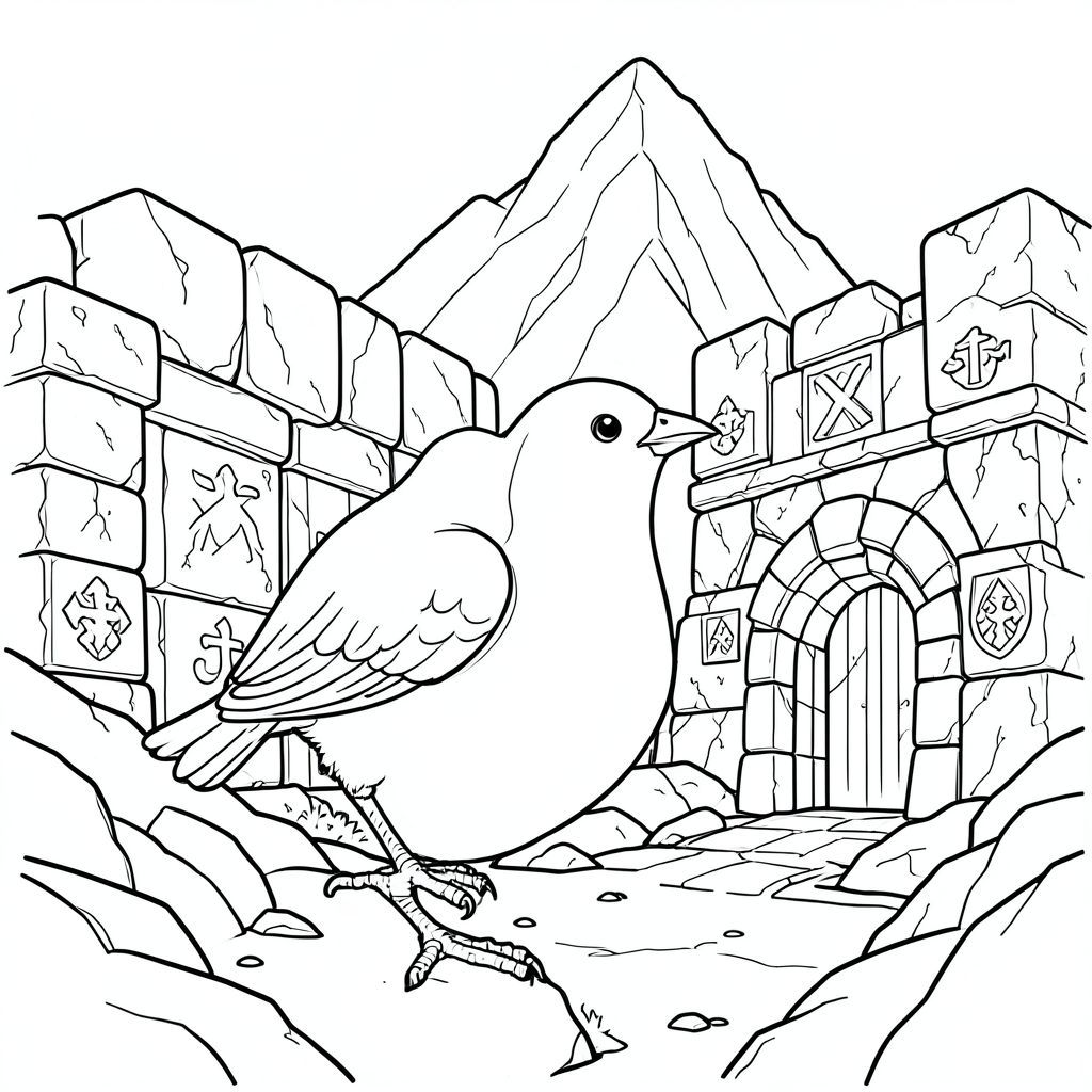 solo, một con chim, một đầu, hai mắt, một mỏ, hai cánh, hai chân, một đuôi, tỷ lệ tự nhiên, quy mô thích hợp trong môi trường, đúng giải phẫu, chim, cổng đá lớn, biểu tượng chạm khắc, đá phong hóa, địa hình đá, đỉnh núi, lối vào hang động, ô cửa hình vòm, chi tiết phức tạp, thực tế, xưa, tô màu, nghệ thuật đường, nền trắng, solo, chủ đề đơn, đúng giải phẫu, giải phẫu hoàn hảo