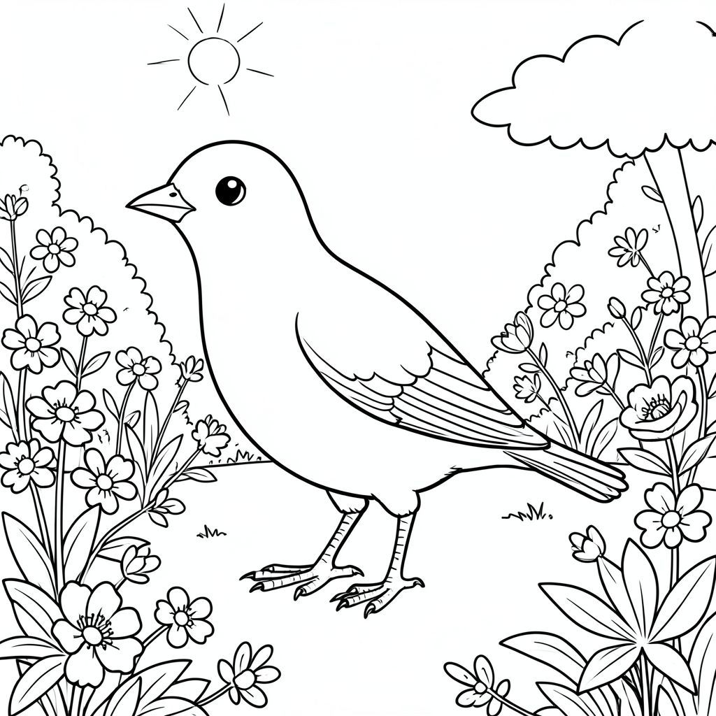 solo, một con chim, một đầu, hai mắt, một mỏ, hai cánh, hai chân, một đuôi, tỷ lệ tự nhiên, quy mô thích hợp trong môi trường, đúng giải phẫu, chim, công viên, vườn, hoa, tươi tốt, ánh sáng mặt trời, rõ ràng, đơn giản, lý lịch, yên bình, thanh thản, trang tô màu, nghệ thuật đường, nền trắng, solo, chủ đề đơn, đúng về mặt giải phẫu, giải phẫu hoàn hảo