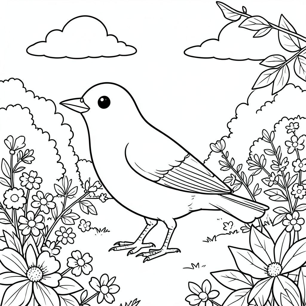 solo, một con chim, một đầu, hai mắt, một mỏ, hai cánh, hai chân, một đuôi, tỷ lệ tự nhiên, quy mô thích hợp trong môi trường, đúng giải phẫu, chim, công viên, vườn, hoa, tươi tốt, nắng, trong sáng, bầu trời, đám mây, lá, chi nhánh, trang màu, nghệ thuật đường, nền trắng, solo, chủ đề đơn, đúng về mặt giải phẫu, giải phẫu hoàn hảo