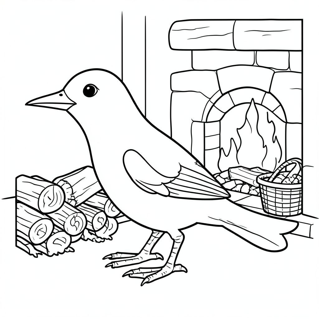 solo, một con chim, một đầu, hai mắt, một mỏ, hai cánh, hai chân, một đuôi, tỷ lệ tự nhiên, quy mô thích hợp trong môi trường, đúng giải phẫu, chim, Lò sưởi, lò sưởi, nhật ký, giỏ, gỗ, ấm áp, ấm cúng, đơn giản, dọn dẹp, lý lịch, tô màu, nghệ thuật đường, nền trắng, solo, chủ đề đơn, chính xác về mặt giải phẫu, giải phẫu hoàn hảo