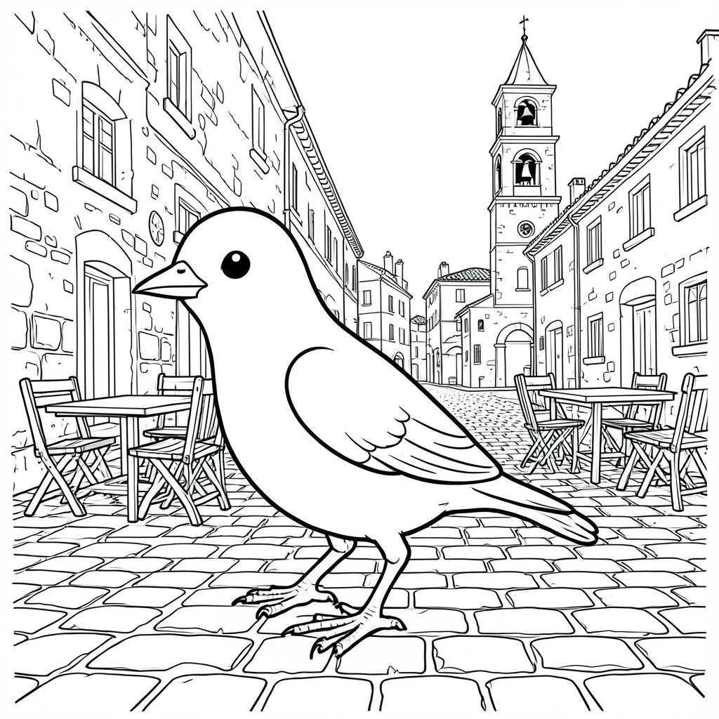 solo, một con chim, một đầu, hai mắt, một mỏ, hai cánh, hai chân, một đuôi, tỷ lệ tự nhiên, quy mô thích hợp trong môi trường, đúng giải phẫu, chim, Piazza, đá cuội, đá phong hóa, bàn ngoài trời, ghế gỗ, tháp chuông, ánh sáng mặt trời, ánh sáng ấm áp, mộc mạc, người Ý, trang màu, nghệ thuật đường nét, nền trắng, solo, chủ đề đơn, đúng giải phẫu, giải phẫu hoàn hảo
