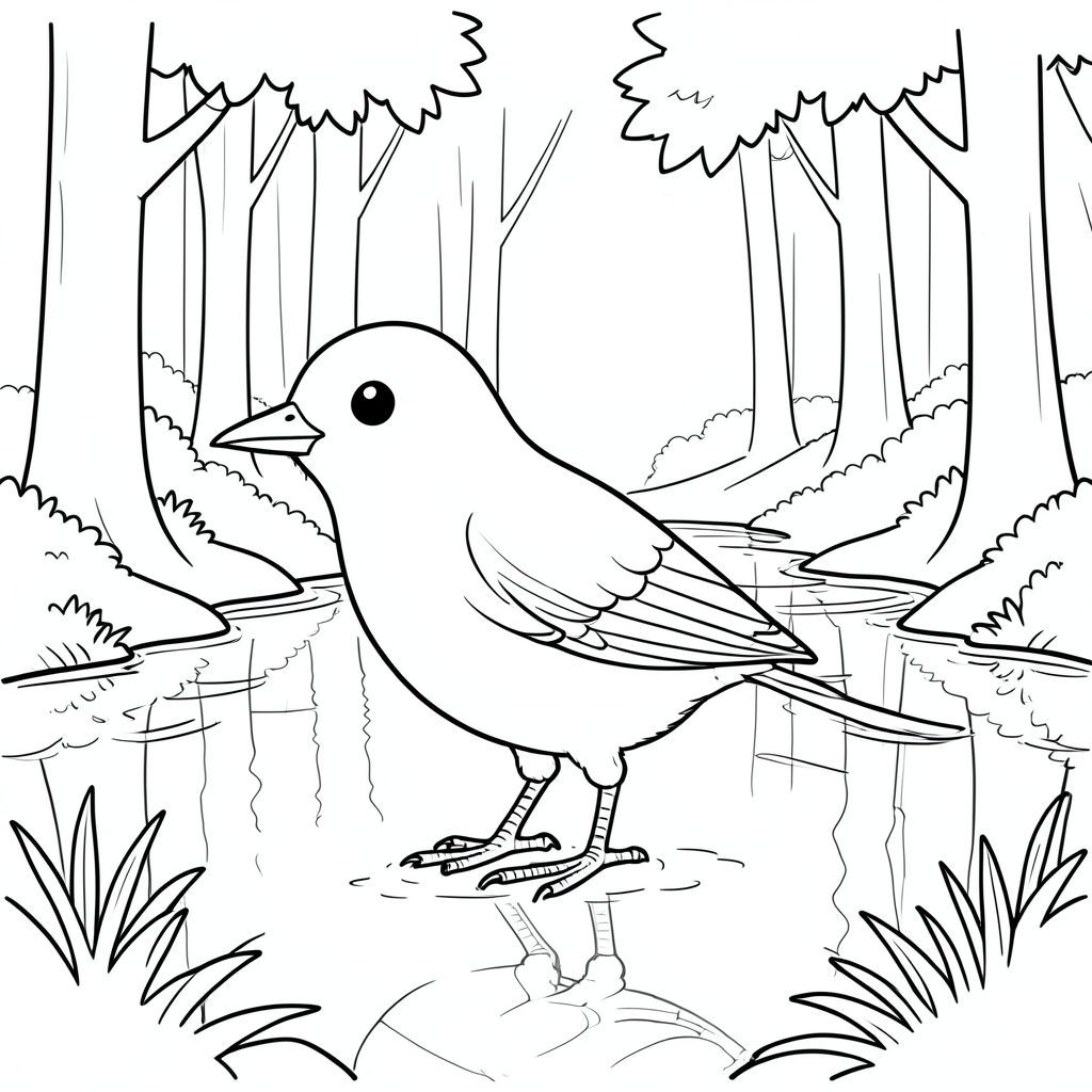 solo, một con chim, một đầu, hai mắt, một mỏ, hai cánh, hai chân, một đuôi, tỷ lệ tự nhiên, quy mô thích hợp trong môi trường, đúng giải phẫu, chim, rừng, ao, phản chiếu, cây cối, nước, trong sáng, thanh thản, đơn giản, sạch sẽ, lý lịch, tô màu, nghệ thuật đường, nền trắng, solo, chủ đề đơn, đúng giải phẫu, giải phẫu hoàn hảo