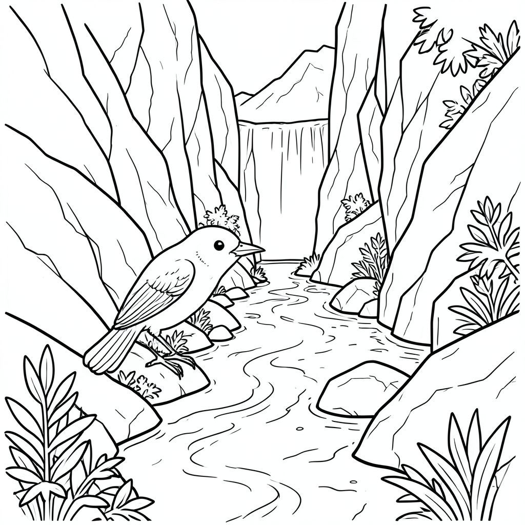 solo, một con chim, một đầu, hai mắt, một mỏ, hai cánh, hai chân, một đuôi, tỷ lệ tự nhiên, quy mô thích hợp trong môi trường, đúng giải phẫu, chim, suối núi, hẻm núi đá, nước xếp tầng, lối đi hẹp, đá, ánh sáng mặt trời, tán lá, chiều sâu, kết cấu, cạnh răng cưa, trang màu, nghệ thuật đường nét, nền trắng, solo, chủ đề đơn, chính xác về mặt giải phẫu, giải phẫu hoàn hảo