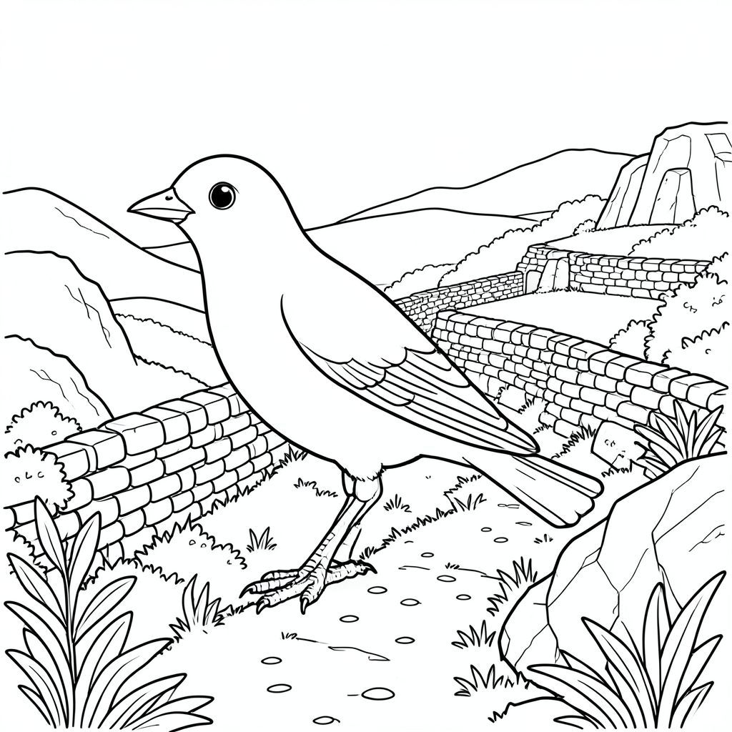 solo, một con chim, một đầu, hai mắt, một mỏ, hai cánh, hai chân, một đuôi, tỷ lệ tự nhiên, quy mô thích hợp trong môi trường, đúng giải phẫu, chim, Sườn đồi bậc thang, Tường đá cổ, cánh đồng, phong cảnh lăn, ánh sáng mặt trời, thảm thực vật, sự hình thành đá, con đường, quanh co, chi tiết, trang tô màu, nghệ thuật đường, nền trắng, solo, chủ đề đơn, chính xác về mặt giải phẫu, giải phẫu hoàn hảo