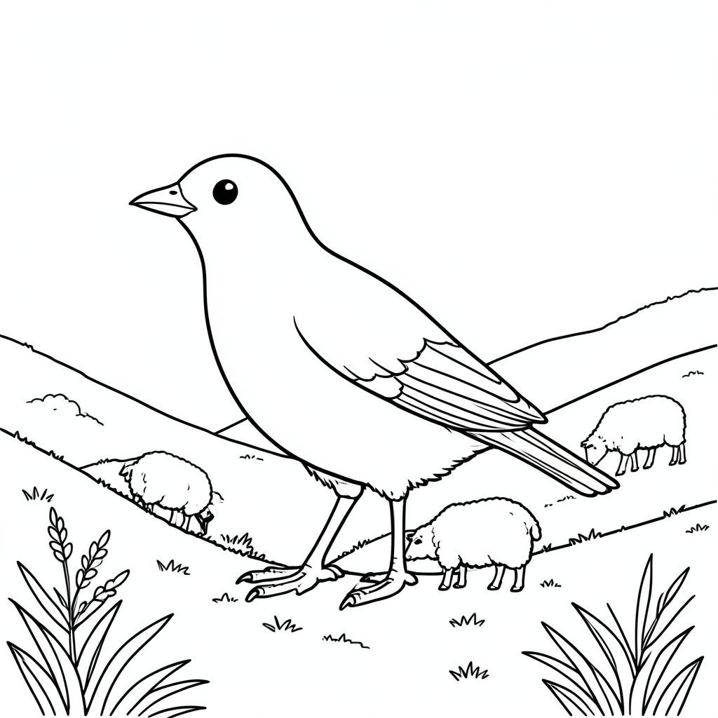 solo, một con chim, một đầu, hai mắt, một mỏ, hai cánh, hai chân, một đuôi, tỷ lệ tự nhiên, quy mô thích hợp trong môi trường, đúng giải phẫu, chim, sườn đồi, phong cảnh lăn, cừu chăn thả, kích thước nhỏ, New Zealand, địa hình lăn, ánh sáng mặt trời, chi tiết, thực tế, mục vụ, trang màu, nghệ thuật đường, nền trắng, solo, chủ đề đơn, đúng giải phẫu, giải phẫu hoàn hảo