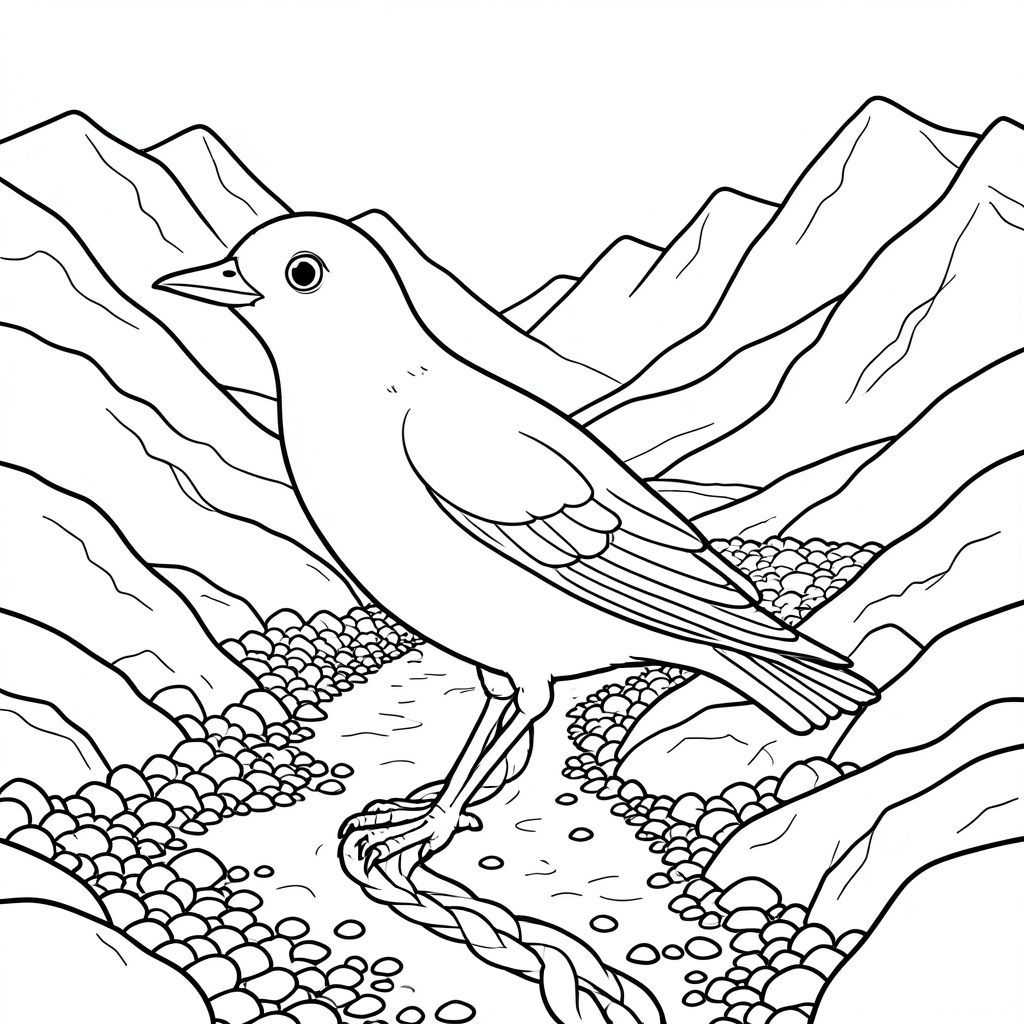 solo, một con chim, một đầu, hai mắt, một mỏ, hai cánh, hai chân, một đuôi, tỷ lệ tự nhiên, quy mô thích hợp trong môi trường, đúng giải phẫu, chim, Thung lũng, núi, sông băng, bện, sỏi, đá, địa hình, ánh sáng mặt trời, độ sâu, phối cảnh, trang tô màu, nghệ thuật đường, nền trắng, solo, chủ đề đơn, đúng về mặt giải phẫu, giải phẫu hoàn hảo