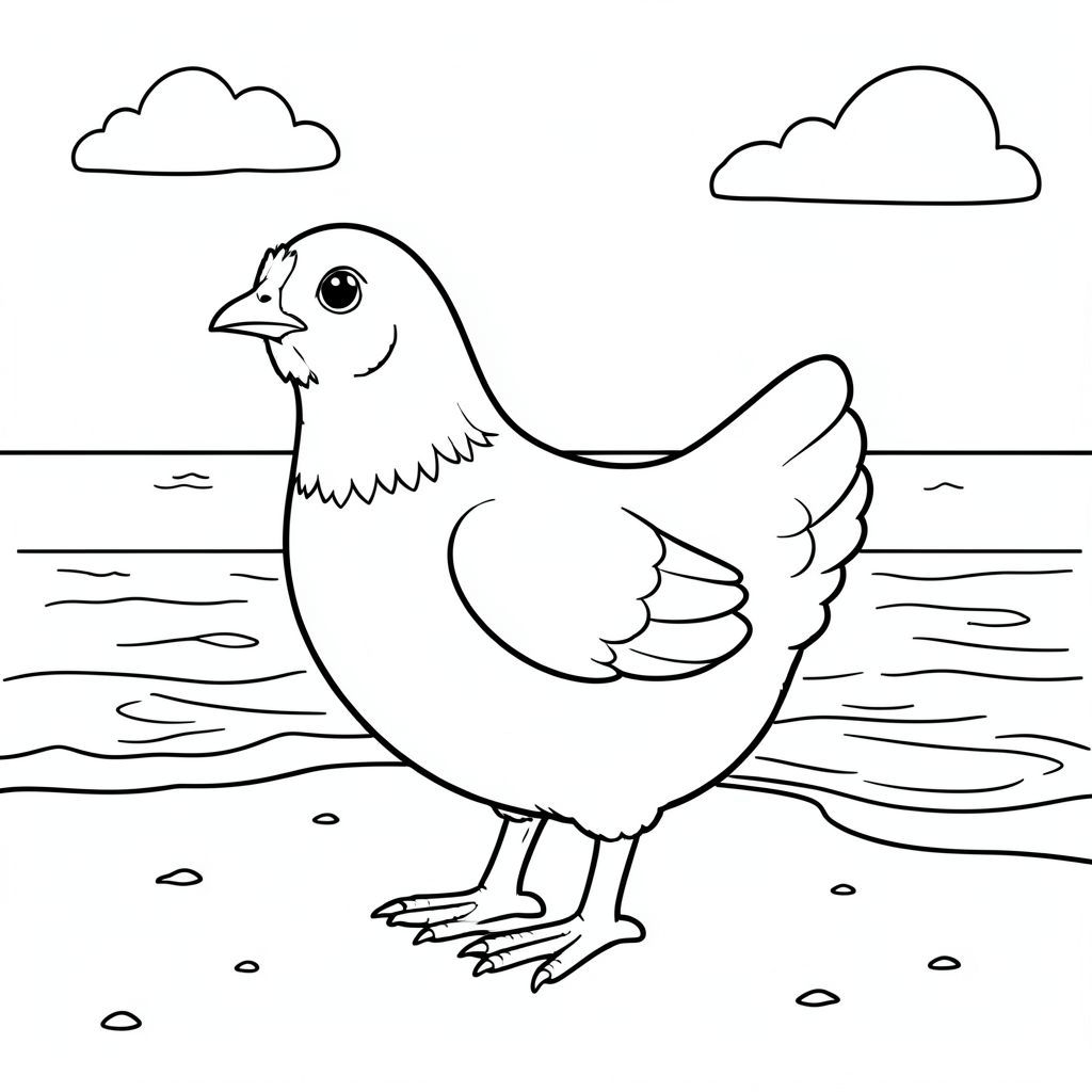 solo, một con chim, một đầu, hai mắt, một mỏ, hai cánh, hai chân, một đuôi, tỷ lệ tự nhiên, quy mô thích hợp trong môi trường, đúng giải phẫu, gà, Bãi biển cát, cát, Nước, bầu trời quang đãng, ánh sáng mặt trời, sóng, bờ biển, nhỏ, đơn giản, sạch sẽ, trang màu, nghệ thuật đường, nền trắng, solo, chủ đề đơn, đúng về mặt giải phẫu, giải phẫu hoàn hảo