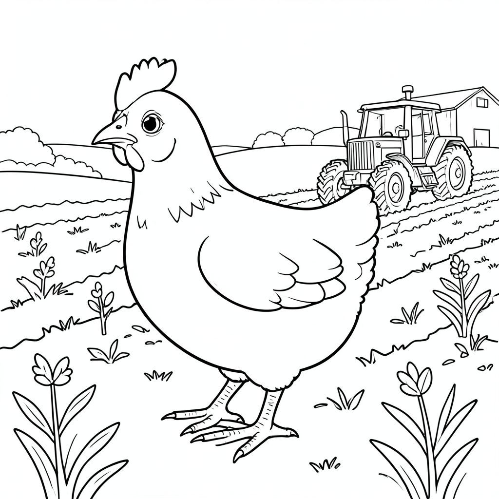 solo, một con chim, một đầu, hai mắt, một mỏ, hai cánh, hai chân, một đuôi, tỷ lệ tự nhiên, quy mô thích hợp trong môi trường, đúng giải phẫu, gà, cánh đồng cày xới, trồng mùa xuân, máy kéo, đơn giản, dọn dẹp, lý lịch, phong cảnh, nông thôn, đất nông nghiệp, đường chân trời, trang tô màu, nghệ thuật đường, nền trắng, solo, chủ đề đơn, chính xác về mặt giải phẫu, giải phẫu hoàn hảo