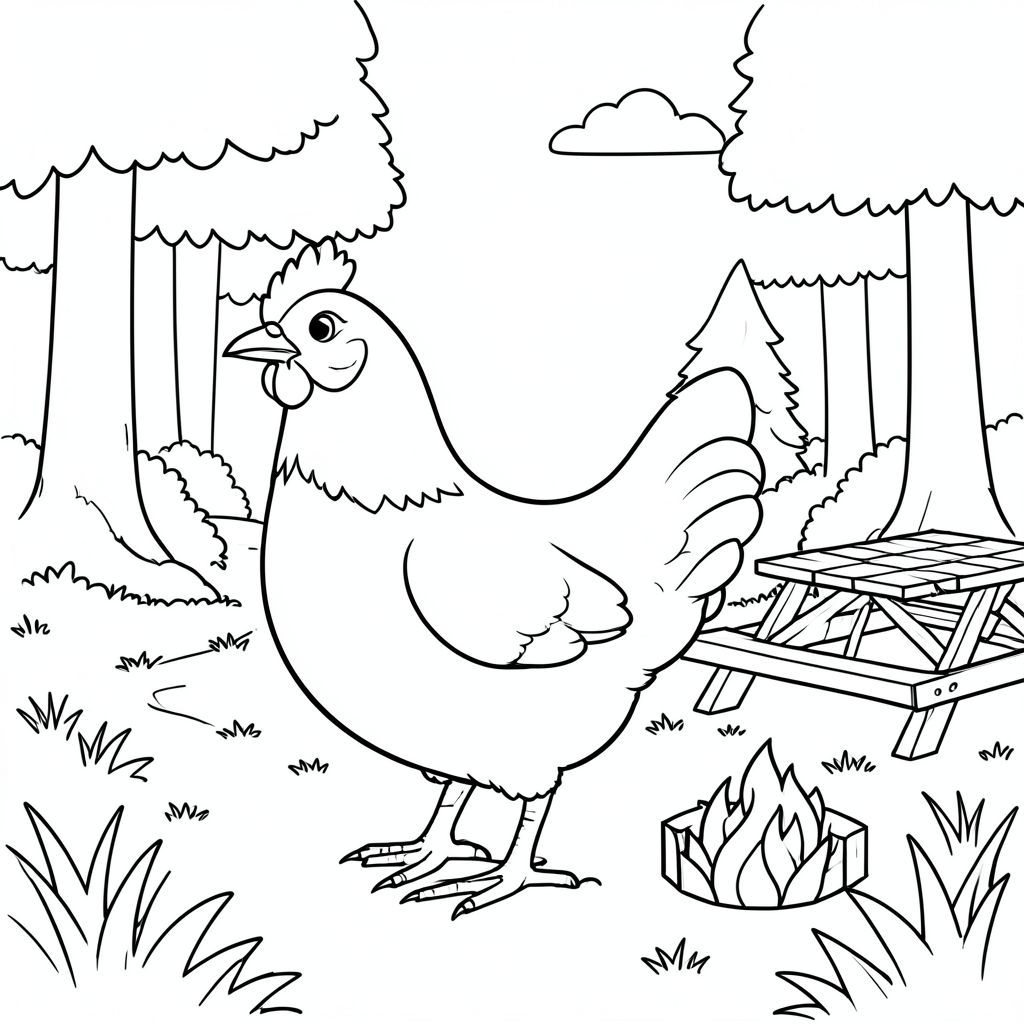 solo, một con chim, một đầu, hai mắt, một mỏ, hai cánh, hai chân, một đuôi, tỷ lệ tự nhiên, quy mô thích hợp trong môi trường, đúng giải phẫu, gà, cây cối, rừng, ánh sáng mặt trời, bầu trời quang đãng, bầu trời, cỏ, con đường, bàn dã ngoại, vòng lửa, kim loại, trang màu, nghệ thuật đường, nền trắng, solo, chủ đề đơn, chính xác về mặt giải phẫu, giải phẫu hoàn hảo