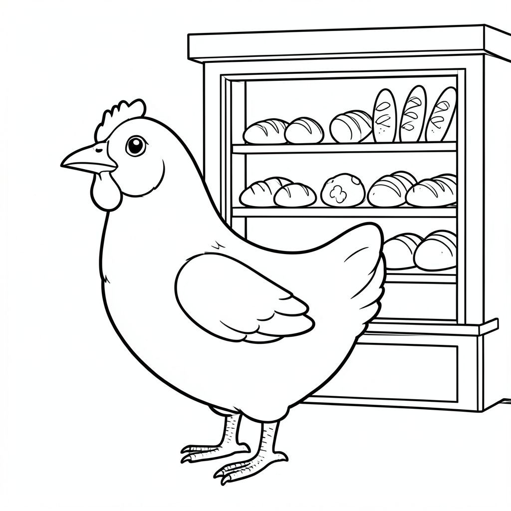 solo, một con chim, một đầu, hai mắt, một mỏ, hai cánh, hai chân, một đuôi, tỷ lệ tự nhiên, quy mô thích hợp trong môi trường, đúng giải phẫu, gà, cửa sổ tiệm bánh, trưng bày, bánh mì, bánh ngọt, ấm áp, đơn giản, dọn dẹp, lý lịch, mặt tiền cửa hàng, cửa sổ, trang tô màu, nghệ thuật đường, nền trắng, solo, chủ đề đơn, đúng về mặt giải phẫu, giải phẫu hoàn hảo
