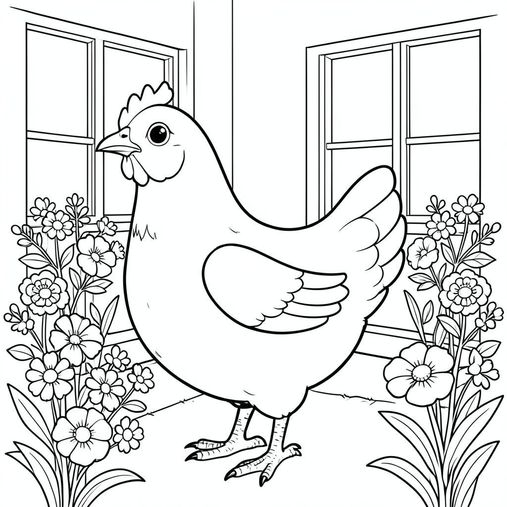 solo, một con chim, một đầu, hai mắt, một mỏ, hai cánh, hai chân, một đuôi, tỷ lệ tự nhiên, quy mô thích hợp trong môi trường, đúng giải phẫu, gà, Hoa, bó hoa, Cửa sổ, nền đơn giản, dọn dẹp, tinh khiết, sách truyện, tinh khiết, trắng, tô màu, nghệ thuật đường, nền trắng, solo, chủ đề đơn, đúng về mặt giải phẫu, giải phẫu hoàn hảo
