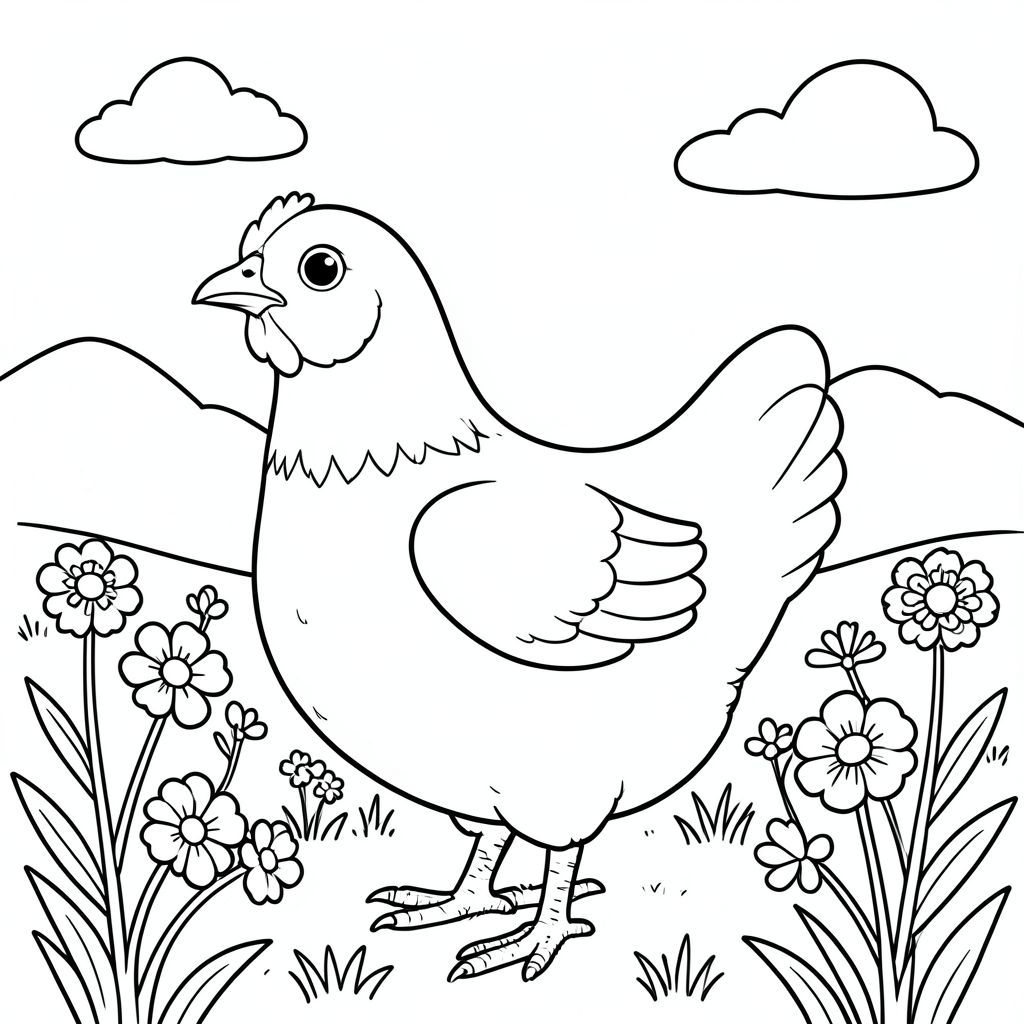 solo, một con chim, một đầu, hai mắt, một mỏ, hai cánh, hai chân, một đuôi, tỷ lệ tự nhiên, quy mô thích hợp trong môi trường, đúng giải phẫu, gà, hoa, cánh đồng, nắng, trong sáng, bầu trời, đơn giản, lý lịch, dọn dẹp, vẽ tay, vẽ nguệch ngoạc, trang tô màu, nghệ thuật đường, nền trắng, solo, chủ đề đơn, chính xác về mặt giải phẫu, giải phẫu hoàn hảo