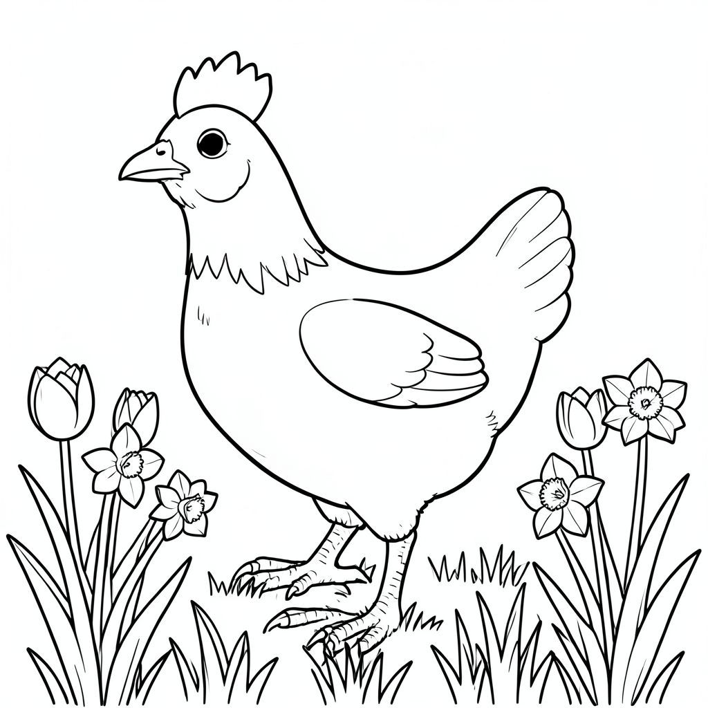 solo, một con chim, một đầu, hai mắt, một mỏ, hai cánh, hai chân, một đuôi, tỷ lệ tự nhiên, quy mô thích hợp trong môi trường, đúng giải phẫu, gà, hoa, vườn, hoa tulip, hoa thủy tiên, ánh sáng mặt trời, trong sáng, cỏ, hàng, gọn gàng, có trật tự, tô màu, nghệ thuật đường, nền trắng, solo, chủ đề đơn, đúng giải phẫu, giải phẫu hoàn hảo