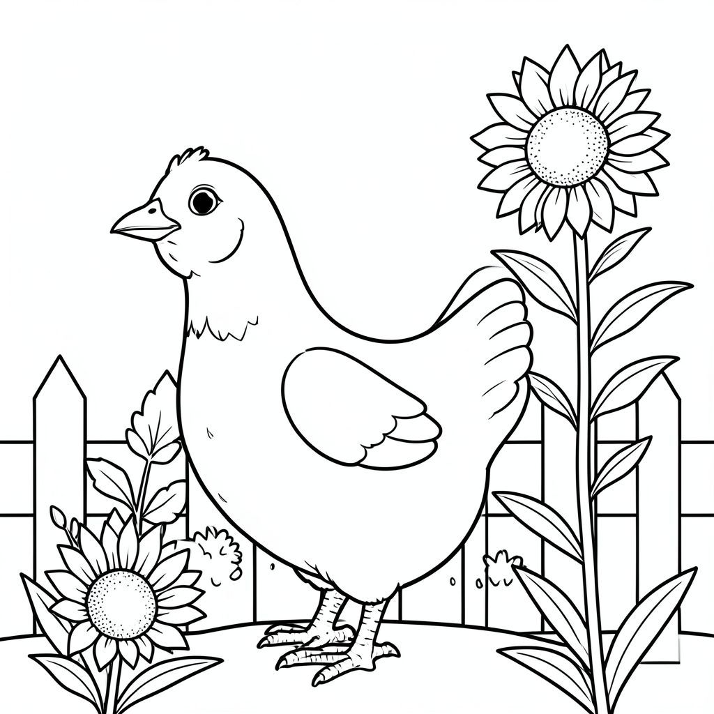solo, một con chim, một đầu, hai mắt, một mỏ, hai cánh, hai chân, một đuôi, tỷ lệ tự nhiên, quy mô thích hợp trong môi trường, đúng giải phẫu, gà, hướng dương, vá, cao, nở hoa, vui mừng, vườn, hàng rào, cọc cọc, đơn giản, dọn dẹp, trang màu, nghệ thuật đường, nền trắng, solo, chủ đề đơn, chính xác về mặt giải phẫu, giải phẫu hoàn hảo