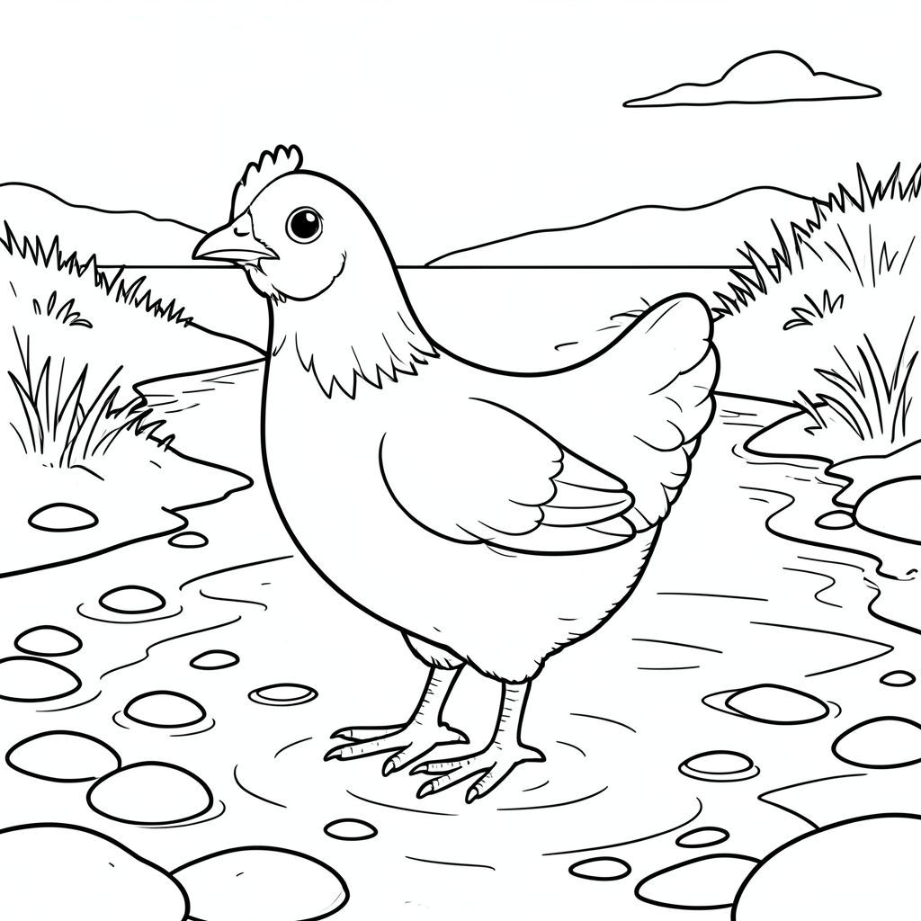 solo, một con chim, một đầu, hai mắt, một mỏ, hai cánh, hai chân, một đuôi, tỷ lệ tự nhiên, quy mô thích hợp trong môi trường, đúng giải phẫu, gà, kênh thủy triều, cồn cát, nước nông, nước ấm, nước trong, ánh sáng mặt trời, đá mịn, cát, gió, đường chân trời, trang màu, nghệ thuật đường nét, nền trắng, solo, chủ đề đơn, đúng giải phẫu, giải phẫu hoàn hảo