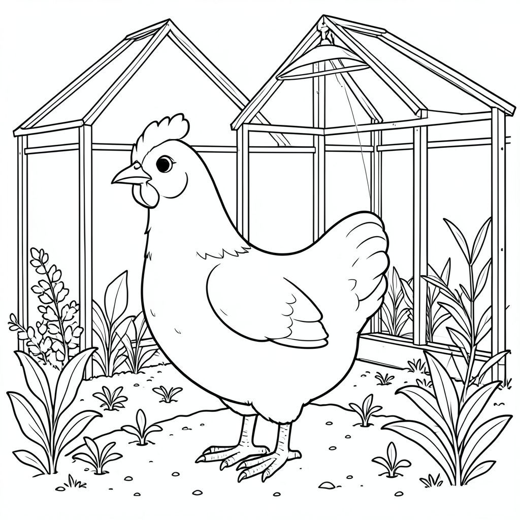solo, một con chim, một đầu, hai mắt, một mỏ, hai cánh, hai chân, một đuôi, tỷ lệ tự nhiên, quy mô thích hợp trong môi trường, đúng giải phẫu, gà, nhà kính, cây con, phát triển đèn, ánh sáng mặt trời, ly, kim loại, khung, đất, thực vật, tán lá, trang tô màu, nghệ thuật đường, nền trắng, solo, chủ đề đơn, đúng giải phẫu, giải phẫu hoàn hảo