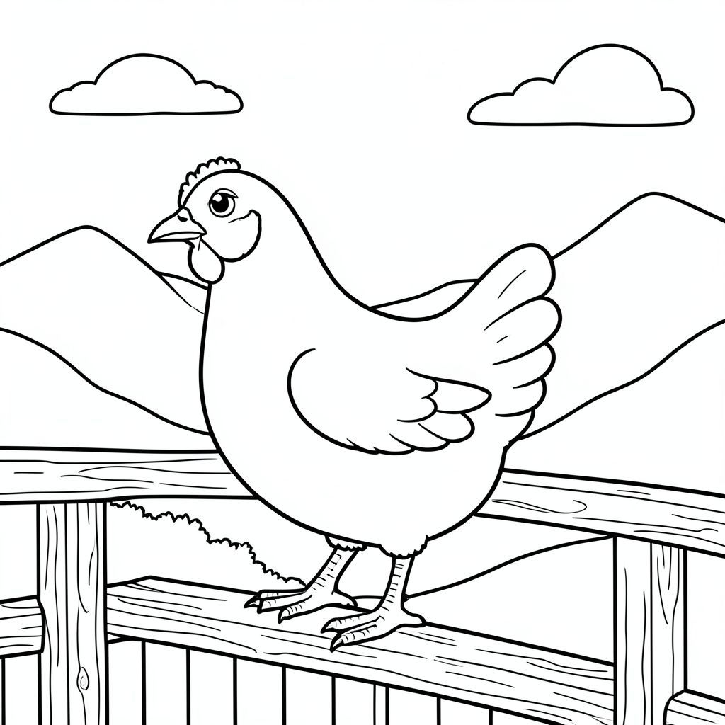 solo, một con chim, một đầu, hai mắt, một mỏ, hai cánh, hai chân, một đuôi, tỷ lệ tự nhiên, quy mô thích hợp trong môi trường, đúng giải phẫu, gà, núi, quan sát, lan can gỗ, đơn giản, dọn dẹp, lý lịch, phong cảnh, đường chân trời, bầu trời, trang màu, nghệ thuật đường, nền trắng, solo, chủ đề đơn, đúng về mặt giải phẫu, giải phẫu hoàn hảo