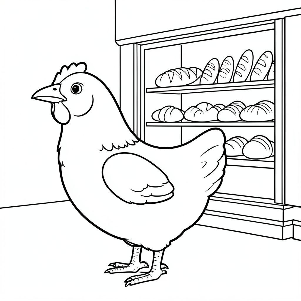 solo, một con chim, một đầu, hai mắt, một mỏ, hai cánh, hai chân, một đuôi, tỷ lệ tự nhiên, quy mô thích hợp trong môi trường, đúng giải phẫu, gà, tiệm bánh, cửa sổ, trưng bà, bánh mì, bánh ngọt, ấm áp, đơn giản, dọn dẹp, lý lịch, mặt tiền cửa hàng, trang tô màu, nghệ thuật đường, nền trắng, solo, chủ đề đơn, đúng về mặt giải phẫu, giải phẫu hoàn hảo