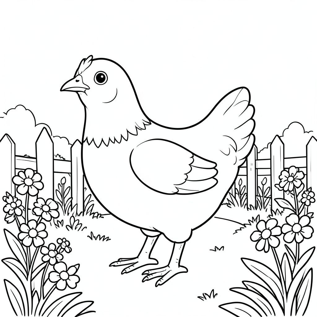 solo, một con chim, một đầu, hai mắt, một mỏ, hai cánh, hai chân, một đuôi, tỷ lệ tự nhiên, quy mô thích hợp trong môi trường, đúng giải phẫu, gà, vườn, hoa, hàng rào, con đường, ánh sáng mặt trời, đơn giản, dọn dẹp, lý lịch, bản vẽ, vẽ tay, tô màu, nghệ thuật đường, nền trắng, solo, chủ đề đơn, chính xác về mặt giải phẫu, giải phẫu hoàn hảo