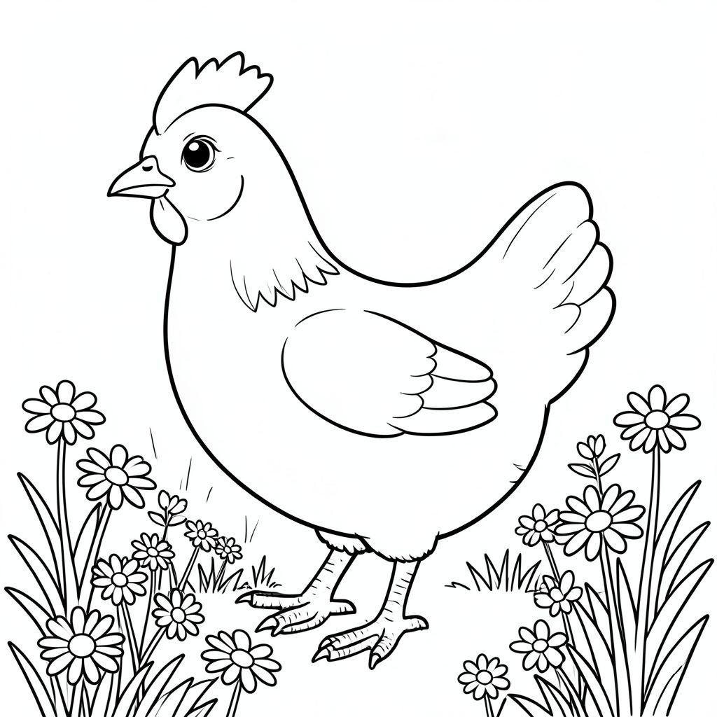 solo, một con chim, một đầu, hai mắt, một mỏ, hai cánh, hai chân, một đuôi, tỷ lệ tự nhiên, quy mô thích hợp trong môi trường, đúng giải phẫu, gà, vườn nắng, hoa cúc, cỏ, hoa, mùa xuân, dọn dẹp, lý lịch, đơn giản, thuần khiết, sách truyện, trang màu, nghệ thuật đường, nền trắng, solo, chủ đề đơn, đúng giải phẫu, giải phẫu hoàn hảo