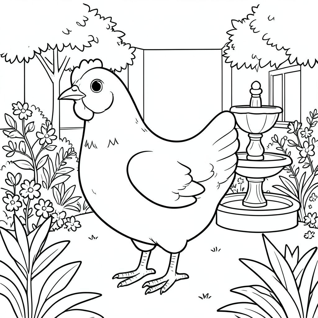 solo, một con chim, một đầu, hai mắt, một mỏ, hai cánh, hai chân, một đuôi, tỷ lệ tự nhiên, quy mô thích hợp trong môi trường, đúng giải phẫu, gà, vườn, sân, thực vật, đài phun nước, nhỏ, yên tĩnh, yên bình, dọn dẹp, đơn giản, lý lịch, trang màu, nghệ thuật đường, nền trắng, solo, chủ đề đơn, đúng về mặt giải phẫu, giải phẫu hoàn hảo