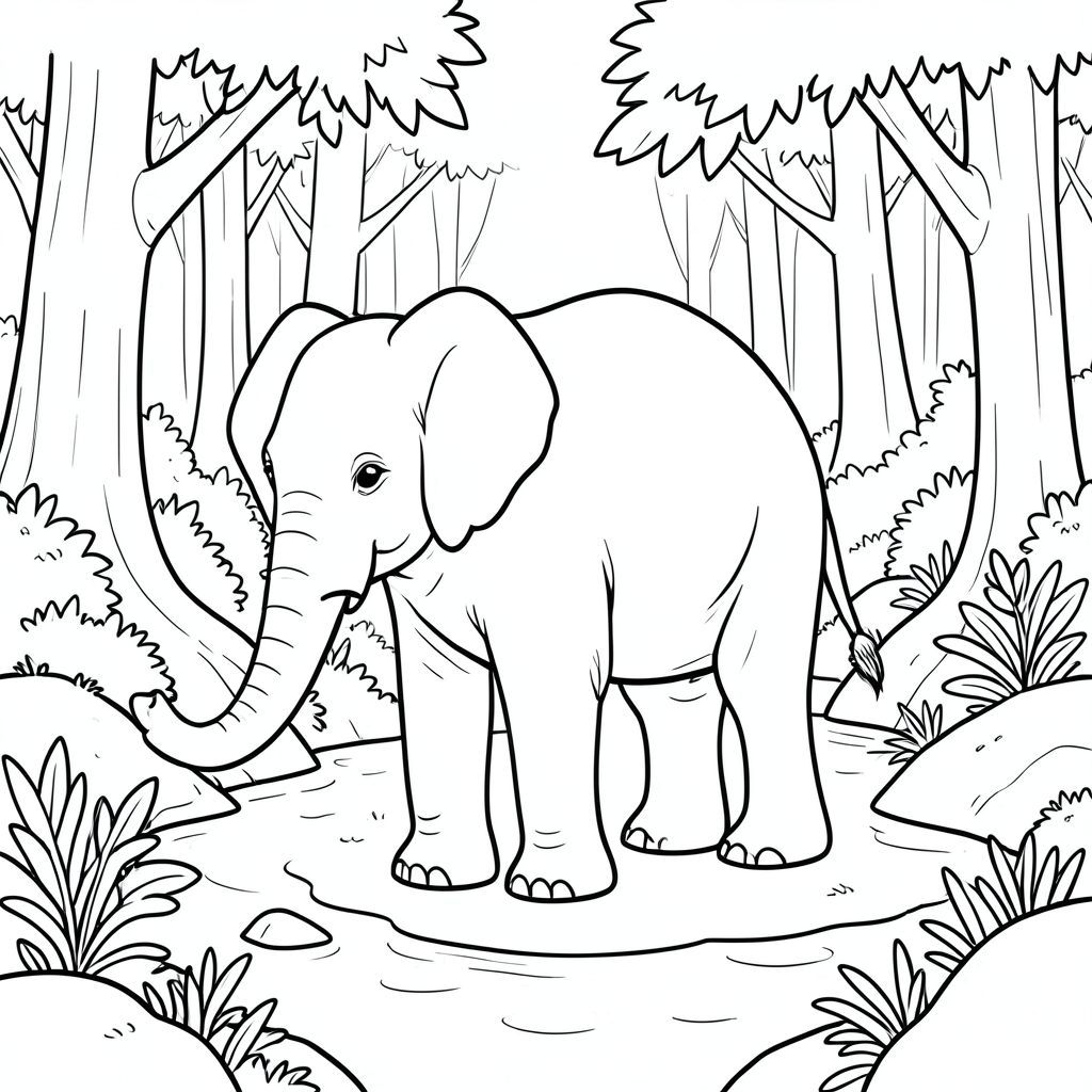solo, một con voi, một đầu, hai mắt, hai tai lớn, một thân cây, bốn chân, một đuôi, bàn chân trên mặt đất vững chắc, tỷ lệ tự nhiên, quy mô thích hợp trong môi trường, đúng về mặt giải phẫu, voi, Rừng cây, suối, Nước, vẫn, yên tĩnh, rừng, cây cối, tán lá, đá, rêu, trang tô màu, nghệ thuật đường, nền trắng, solo, chủ đề đơn, đúng về mặt giải phẫu, giải phẫu hoàn hảo