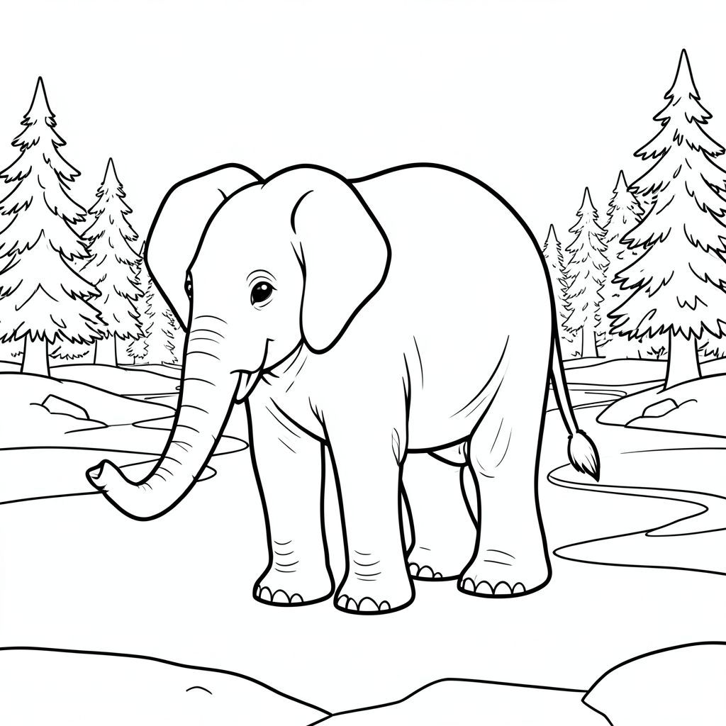 solo, một con voi, một đầu, hai mắt, hai tai lớn, một thân cây, bốn chân, một đuôi, bàn chân trên nền vững chắc, tỷ lệ tự nhiên, quy mô thích hợp trong môi trường, đúng về mặt giải phẫu, voi, Hồ đóng băng, tuyết, cây thông, mùa đông, rộng lớn, hoang vắng, phong cảnh, lạnh, băng giá, phản chiếu, trang màu, nghệ thuật đường, nền trắng, solo, chủ đề đơn, đúng về mặt giải phẫu, giải phẫu hoàn hảo