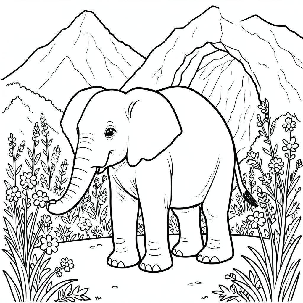 solo, một con voi, một đầu, hai mắt, hai tai lớn, một thân cây, bốn chân, một đuôi, bàn chân trên nền vững chắc, tỷ lệ tự nhiên, quy mô thích hợp trong môi trường, đúng về mặt giải phẫu, voi, núi, hang động, lối vào, hoa dại, núi cao, thảm thực vật, dày đặc, cao, thân cây, ánh sáng mặt trời, trang màu, nghệ thuật đường, nền trắng, solo, chủ đề đơn, đúng giải phẫu, giải phẫu hoàn hảo