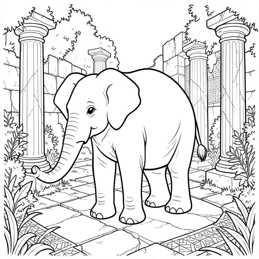 solo, một con voi, một đầu, hai mắt, hai tai lớn, một thân cây, bốn chân, một đuôi, bàn chân trên nền vững chắc, tỷ lệ tự nhiên, quy mô thích hợp trong môi trường, đúng về mặt giải phẫu, voi, Tàn tích cổ, cột đá cẩm thạch, đá phong hóa, vỉa hè nứt, thảm thực vật mọc um tùm, lọc ánh sáng mặt trời, bụi, tường đổ nát, gạch khảm, hoa văn hình học, trang màu, nghệ thuật đường, nền trắng, solo, chủ đề đơn, chính xác về mặt giải phẫu, giải phẫu hoàn hảo