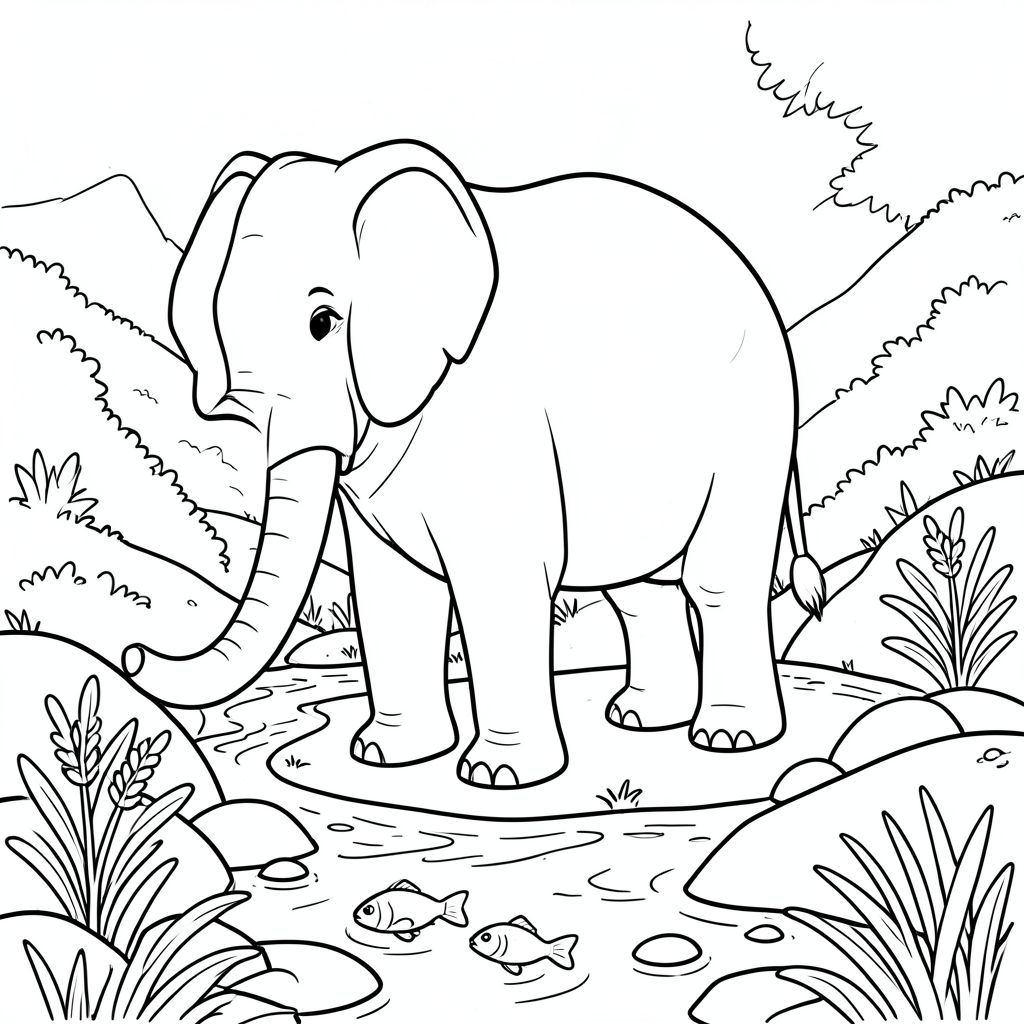 solo, một con voi, một đầu, hai mắt, hai tai lớn, một thân cây, bốn chân, một đuôi, chân trên mặt đất vững chắc, tỷ lệ tự nhiên, quy mô thích hợp trong môi trường, đúng về mặt giải phẫu, voi, suối núi, cải xoong, cá nhỏ, nước trong, đá, ánh sáng mặt trời, đá mịn, tán lá, nước chảy, dốc thoai thoải, tô màu, nghệ thuật đường, nền trắng, solo, chủ đề đơn, đúng giải phẫu, Giải phẫu hoàn hảo