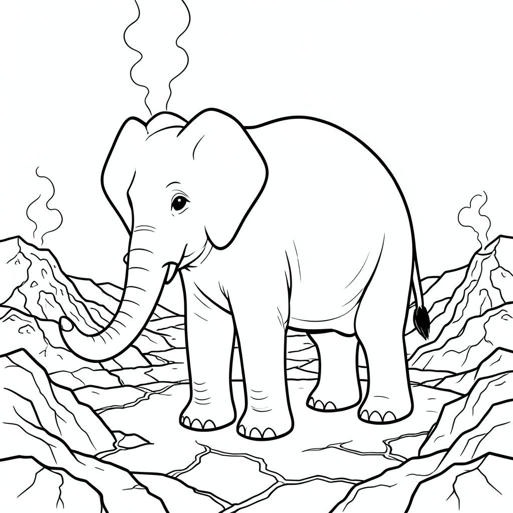 solo, một con voi, một đầu, hai mắt, hai tai lớn, một thân cây, bốn chân, một đuôi, chân trên nền vững chắc, tỷ lệ tự nhiên, quy mô thích hợp trong môi trường, đúng giải phẫu, voi, đá núi lửa, dung nham cứng, khói khói, cát, hoang vắng, cằn cỗi, đất nứt, cạnh răng cưa, nhiệt độ cao, trầm tích khoáng sản, trang màu, nghệ thuật đường nét, nền trắng, solo, chủ đề đơn, đúng giải phẫu, Giải phẫu hoàn hảo