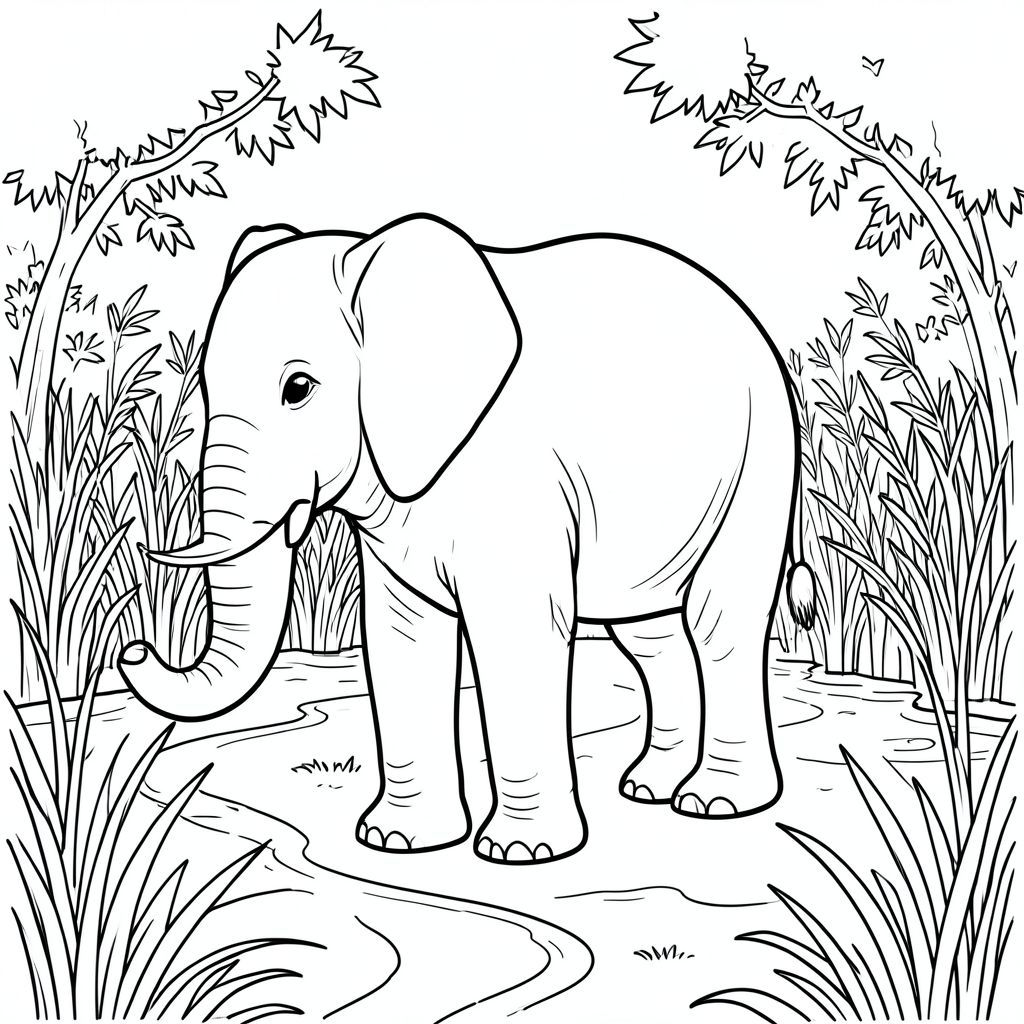 solo, một con voi, một đầu, hai mắt, hai tai lớn, một thân cây, bốn chân, một đuôi, chân trên nền vững chắc, tỷ lệ tự nhiên, quy mô thích hợp trong môi trường, đúng về mặt giải phẫu, voi, đồng bằng, đất ngập nước, đường thủy, lau sậy, dày đặc, thảm thực vật, quanh co, con đường, ánh sáng mặt trời, lốm đốm, trang màu, nghệ thuật đường, nền trắng, solo, chủ đề đơn, đúng về mặt giải phẫu, giải phẫu hoàn hảo