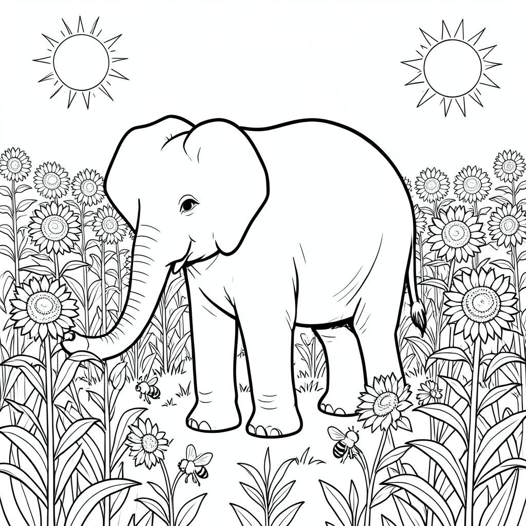 solo, một con voi, một thân cây, bốn chân, hai tai lớn, một đuôi, chính xác về mặt giải phẫu, voi, cánh đồng hướng dương, ong, mặt trời mùa hè, giữa trưa, nhiệt, rộng lớn, mở rộng, cao, cuống, dày đặc, trang màu, nghệ thuật đường, nền trắng, solo, chủ đề đơn, đúng về mặt giải phẫu, giải phẫu hoàn hảo