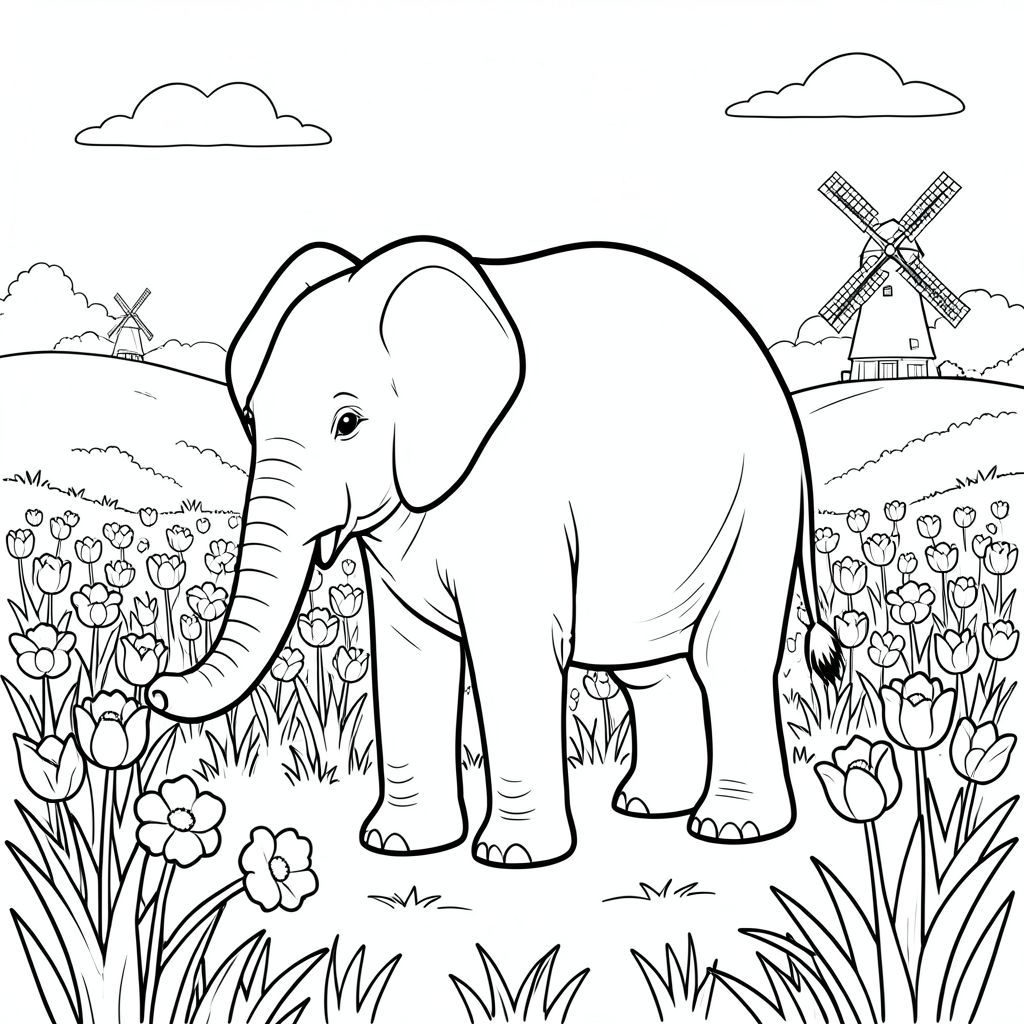 solo, một con voi, một thân cây, bốn chân, hai tai lớn, một đuôi, đúng về mặt giải phẫu, voi, cánh đồng hoa tulip, nở hoa, cỏ, đồi thoai thoải, cối xay gió, xa, mờ mịt, bầu trời quang đãng, ánh sáng mặt trời, ấm áp, trang màu, nghệ thuật đường, nền trắng, solo, chủ đề đơn, đúng về mặt giải phẫu, giải phẫu hoàn hảo