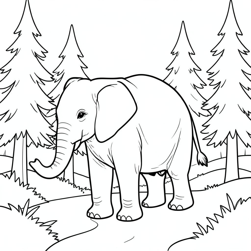 solo, một con voi, một thân cây, bốn chân, hai tai lớn, một đuôi, đúng về mặt giải phẫu, voi, con đường rừng, cây thông, cao, ánh sáng mặt trời, nền đơn giản, sạch sẽ, tuyến tính, nghệ thuật đường, và trắng, thuần khiết, trang màu, nghệ thuật đường, nền trắng, solo, chủ đề đơn, đúng giải phẫu, giải phẫu hoàn hảo