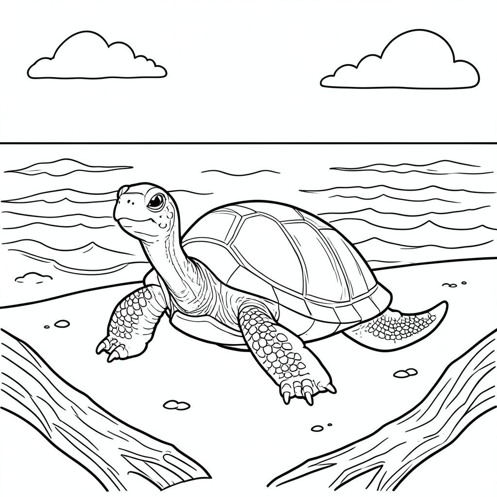 solo, rùa đơn, một đầu, hai mắt, bốn chân, một vỏ, một đuôi, bàn chân trên mặt đất vững chắc, tỷ lệ tự nhiên, quy mô thích hợp trong môi trường, đúng giải phẫu, rùa, bờ biển, cát, lũa, chỗ ngồi, ấm áp, đại dương, bầu trời, sóng, ánh sáng mặt trời, trang màu, nghệ thuật đường, nền trắng, solo, chủ đề đơn, đúng về mặt giải phẫu, giải phẫu hoàn hảo