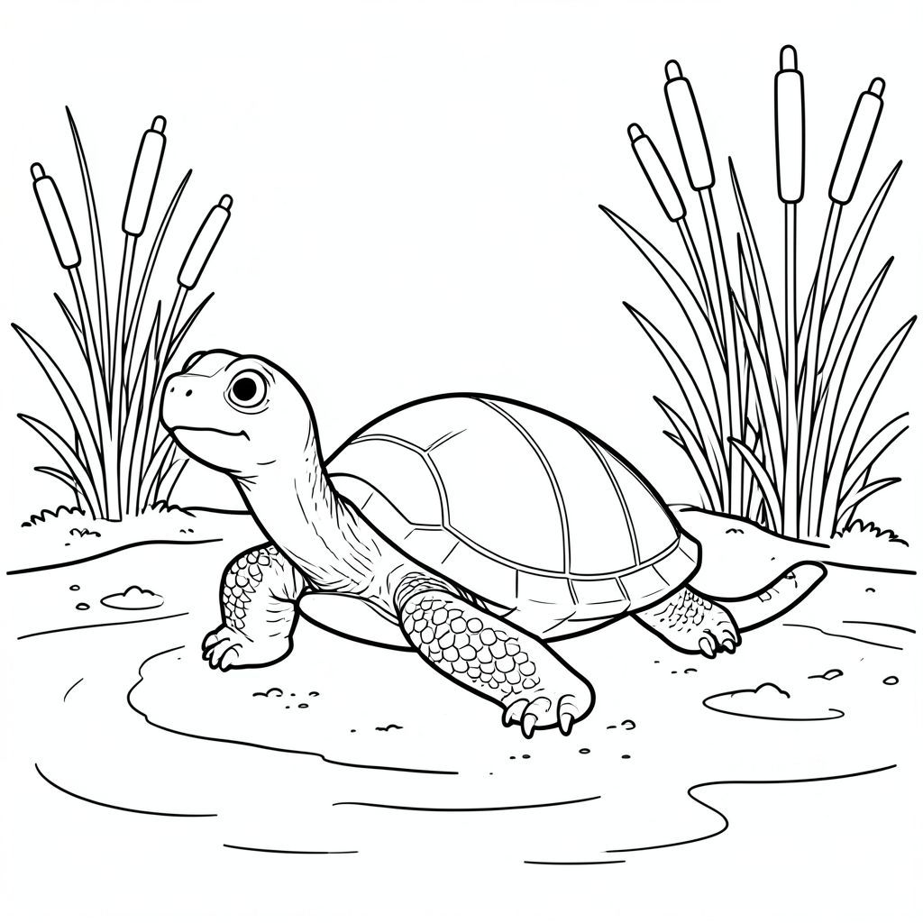 solo, rùa đơn, một đầu, hai mắt, bốn chân, một vỏ, một đuôi, bàn chân trên mặt đất vững chắc, tỷ lệ tự nhiên, quy mô thích hợp trong môi trường, đúng giải phẫu, rùa, Lau sậy, đuôi mèo, bờ sông, nước lặng, đất, ánh sáng mặt trời, nhỏ, đơn giản, sạch sẽ, yên bình, trang màu, nghệ thuật đường nét, nền trắng, solo, chủ đề đơn, đúng giải phẫu, giải phẫu hoàn hảo