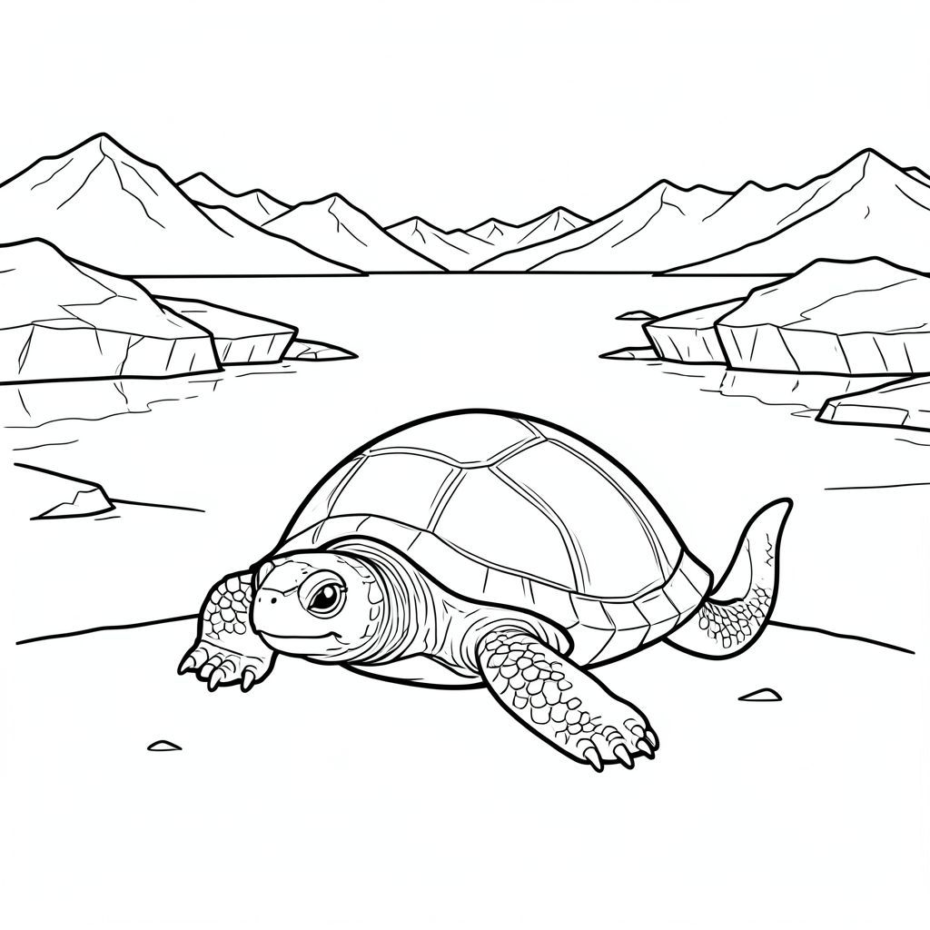 solo, rùa đơn, một đầu, hai mắt, bốn chân, một vỏ, một đuôi, bàn chân trên mặt đất vững chắc, tỷ lệ tự nhiên, quy mô thích hợp trong môi trường, đúng giải phẫu, rùa, Sông băng, đầm phá, tảng băng trôi, nước, thanh thản, điềm tĩnh, rộng lớn, mở rộng, xa, núi, trang màu, nghệ thuật đường nét, nền trắng, solo, chủ đề đơn, đúng giải phẫu, giải phẫu hoàn hảo
