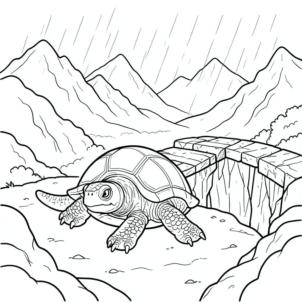 solo, rùa đơn, một đầu, hai mắt, bốn chân, một vỏ, một đuôi, bàn chân trên mặt đất vững chắc, tỷ lệ tự nhiên, quy mô thích hợp trong môi trường, đúng giải phẫu, rùa, Sương mù, núi, vực thẳm, cầu, đá, Phong hóa, mưa, sương mù, Xoáy, hơi, Trang tô màu, nghệ thuật đường, nền trắng, solo, chủ đề đơn, chính xác về mặt giải phẫu, giải phẫu hoàn hảo