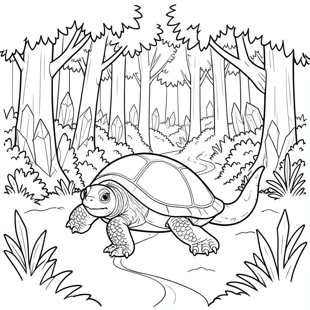 solo, rùa đơn, một đầu, hai mắt, bốn chân, một vỏ, một đuôi, bàn chân trên mặt đất vững chắc, tỷ lệ tự nhiên, quy mô thích hợp trong môi trường, đúng về mặt giải phẫu, rùa, Cây pha lê, mờ, giống như đá quý, rừng, cao chót vót, dày đặc, tán lá, quanh co, con đường, lốm đốm, trang màu, nghệ thuật đường, nền trắng, solo, chủ đề đơn, đúng về mặt giải phẫu, giải phẫu hoàn hảo