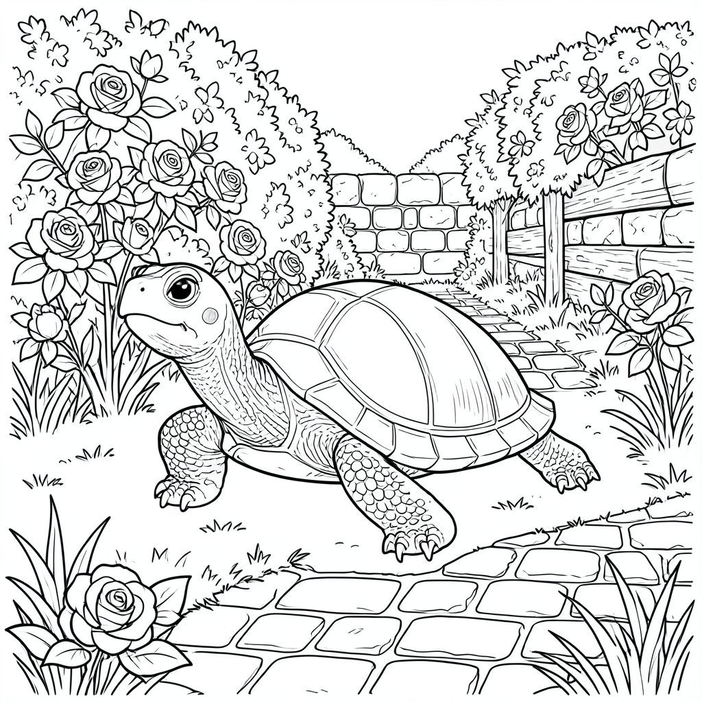 solo, rùa đơn, một đầu, hai mắt, bốn chân, một vỏ, một đuôi, bàn chân trên nền vững chắc, tỷ lệ tự nhiên, quy mô thích hợp trong môi trường, đúng giải phẫu, rùa, Hoa hồng, hàng rào, Bức tường đá, Gỗ phong hóa, con đường lát đá cuội, cỏ, ánh sáng mặt trời, phối cảnh khí quyển, phong cách cổ điển, kết cấu chi tiết, trang màu, nghệ thuật đường, nền trắng, solo, chủ đề đơn, đúng giải phẫu, giải phẫu hoàn hảo