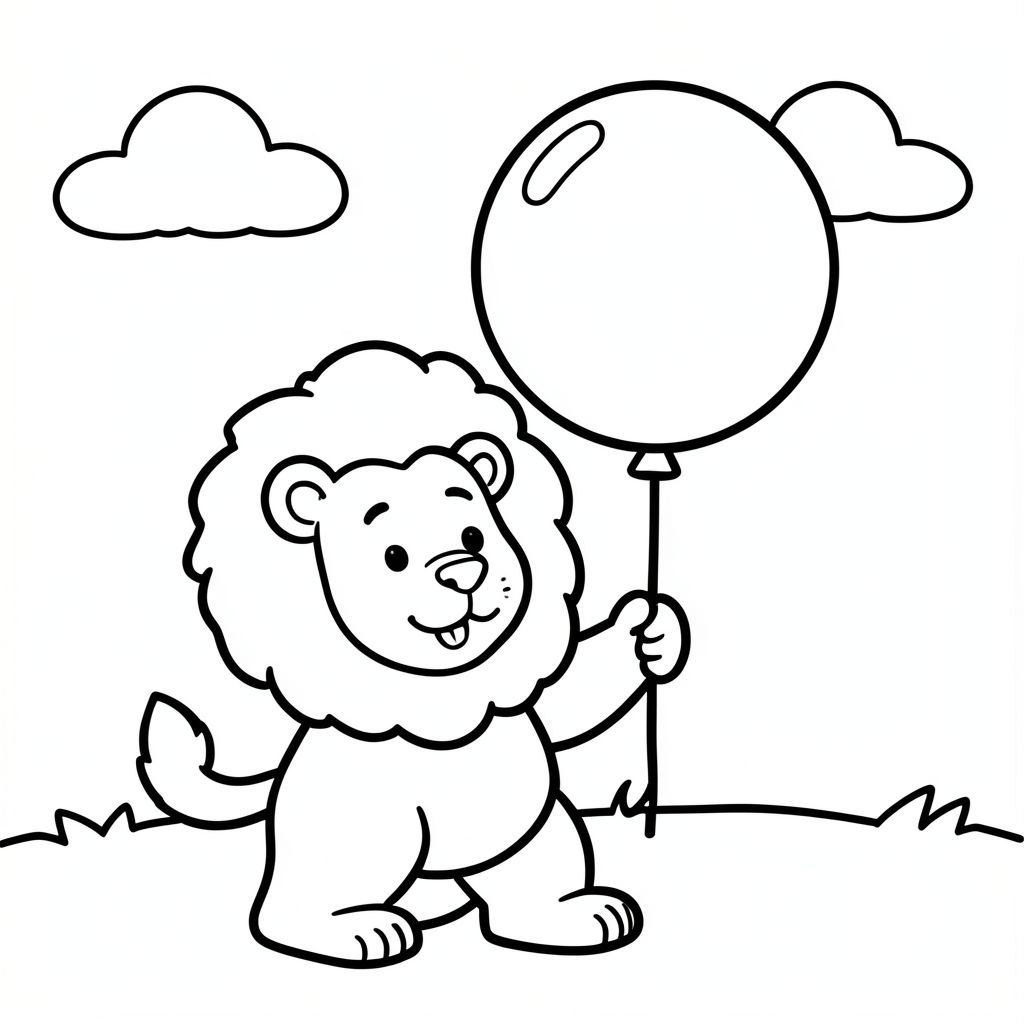 Sư tử cầm bóng bay – quả bóng tròn to, dễ tô màu. Đường viền đậm dày Hình dạng lớn, đơn giản Nền tối thiểu (mặt trời, mây, cỏ) Đen trắng, không đổ bóng Biểu cảm vui vẻ, vui tươi