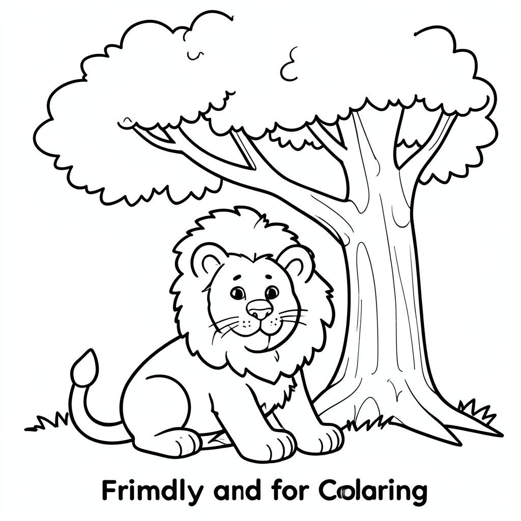 "Sư tử thân thiện ngồi dưới gốc cây, đường viền đen trắng để tô màu"