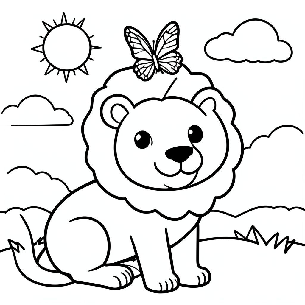 Sư tử với một con bướm – con bướm ngồi trên mũi sư tử. Đường viền đậm dày Hình dạng lớn, đơn giản Nền tối thiểu (mặt trời, mây, cỏ) Đen trắng, không đổ bóng Biểu cảm vui vẻ, vui tươi
