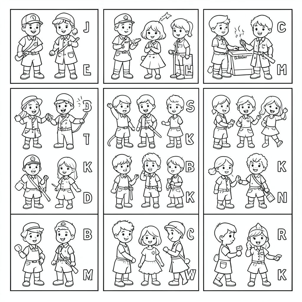 Tạo 50 trang tô màu riêng lẻ cho một cuốn sách với trẻ em trong trang phục lao động khác nhau và các chữ cái theo thứ tự bảng chữ cái bên cạnh mỗi trang