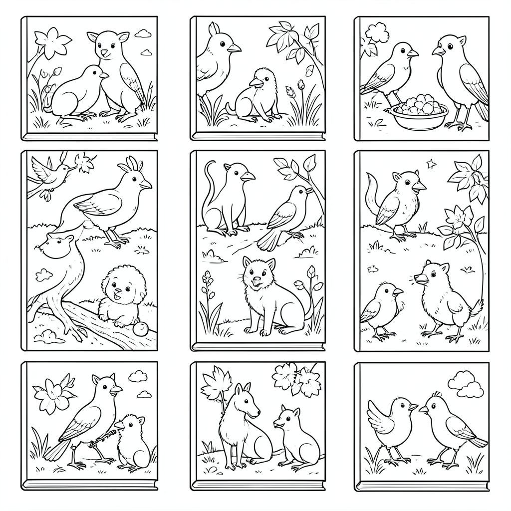 Tạo cho tôi 10 trang cá nhân để bìa sách về động vật và chim