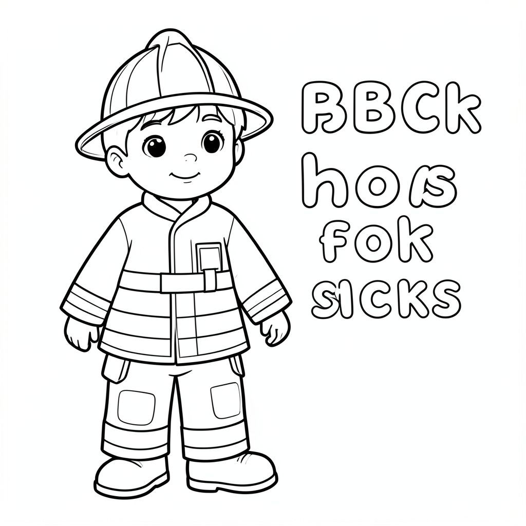 Tạo cho tôi một đứa trẻ mặc trang phục lính cứu hỏa với các từ bảng chữ cái bên cạnh để tô màu