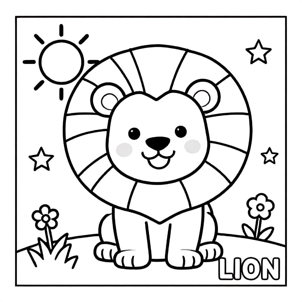 Tạo một bức tranh tô màu đen trắng cao cấp cho trẻ em từ 3–8 tuổi. MỘT CON SƯ TỬ CON RẤT LỚN dễ thương mỉm cười với bờm bồng bềnh. Thêm mặt trời, cỏ, hoa, sao. Đường viền đậm, không đổ bóng, bao gồm đường viền. VĂN BẢN: "Sư tử"